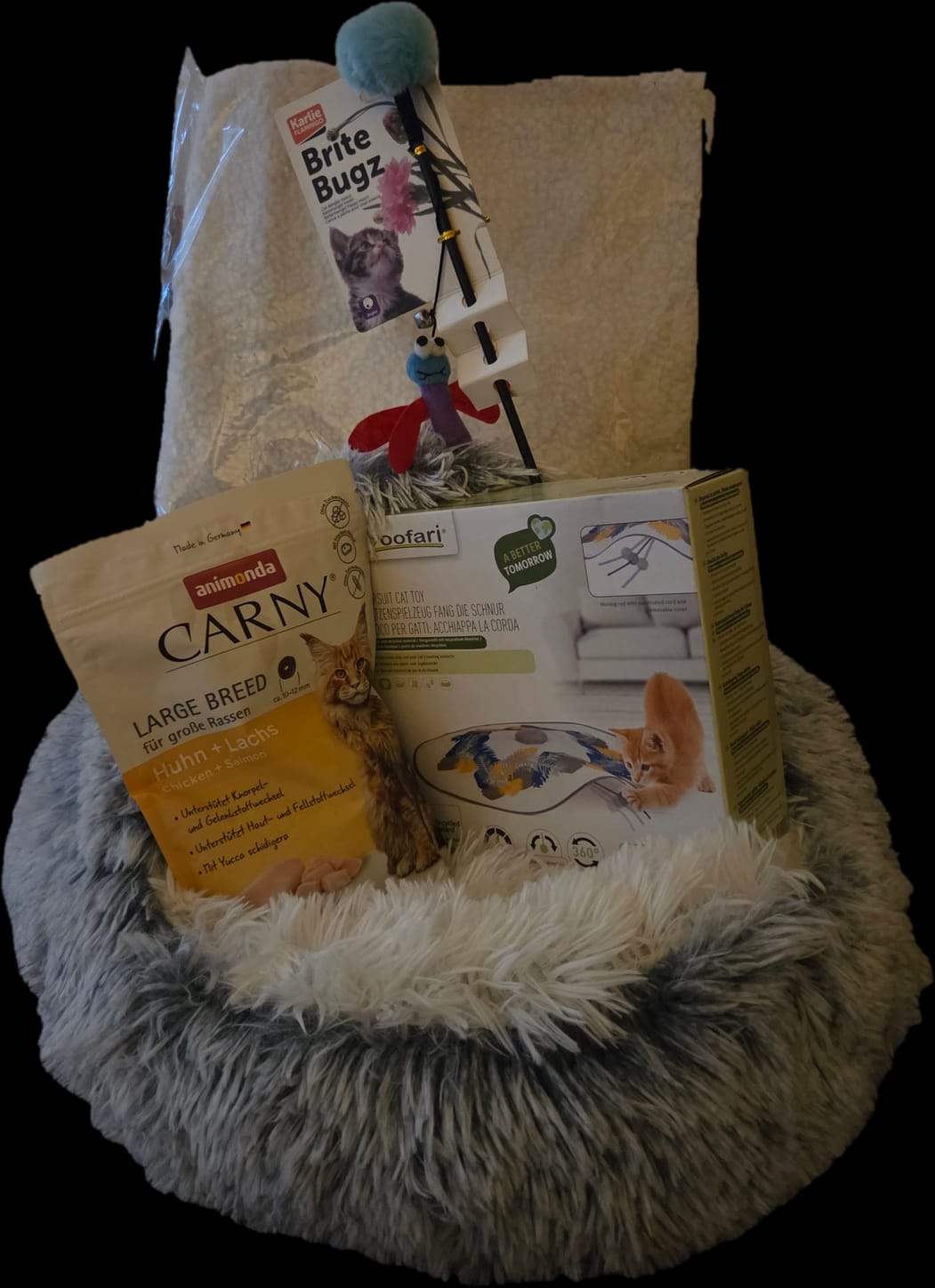 Wat een geluksvogel! Jij hebt een heerlijk verwenpakket voor je kat in de wacht gesleept, boordevol comfort, spel en lekkers: