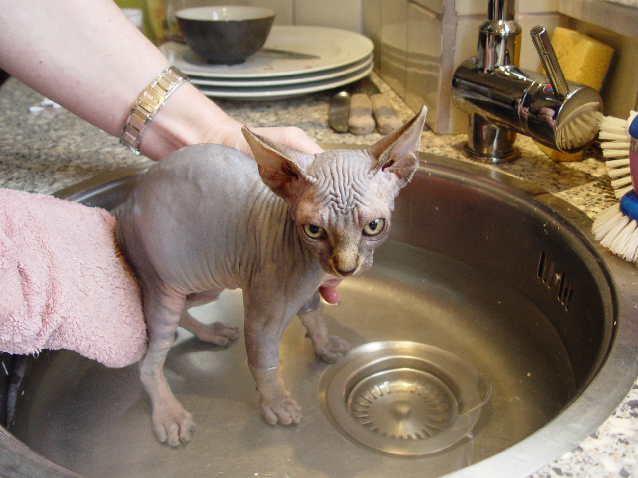 Eenmaal in de auto, jij gewikkeld in een dekentje op mijn schoot, begon de discussie om een goede naam voor je te vinden. Moeilijk, moeilijk hoor. Maar wacht eens? Jaaa... dat moest het worden "Sproetje" want je zat als een klein tijgertje onder de bruine vlekjes. Gelukkig een naam die perfect bij je paste. Eenmaal thuis werd je volledig geadopteerd door ons andere Sphynxje, die de moederrol overnam. Na een paar dagen leken de bruine vlekjes wel te groeien, Huh? Misschien toch maar eens in bad? Zo gezegd, zo gedaan, Kleine Sproetje ging in bad.............. en wat kwam er uit het badwater tevoorschijn? Een egaal bruin katje met een roze buikje en... geen enkele sproet meer te zien😊 tja. Sproetje bleef toch maar Sproetje.