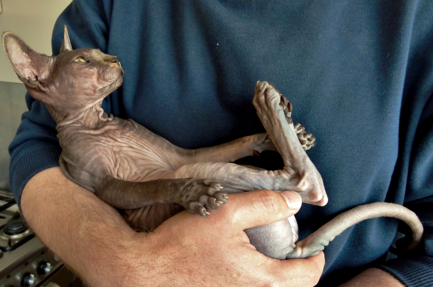 Eenmaal in de auto, jij gewikkeld in een dekentje op mijn schoot, begon de discussie om een goede naam voor je te vinden. Moeilijk, moeilijk hoor. Maar wacht eens? Jaaa... dat moest het worden "Sproetje" want je zat als een klein tijgertje onder de bruine vlekjes. Gelukkig een naam die perfect bij je paste. Eenmaal thuis werd je volledig geadopteerd door ons andere Sphynxje, die de moederrol overnam. Na een paar dagen leken de bruine vlekjes wel te groeien, Huh? Misschien toch maar eens in bad? Zo gezegd, zo gedaan, Kleine Sproetje ging in bad.............. en wat kwam er uit het badwater tevoorschijn? Een egaal bruin katje met een roze buikje en... geen enkele sproet meer te zien😊 tja. Sproetje bleef toch maar Sproetje.
