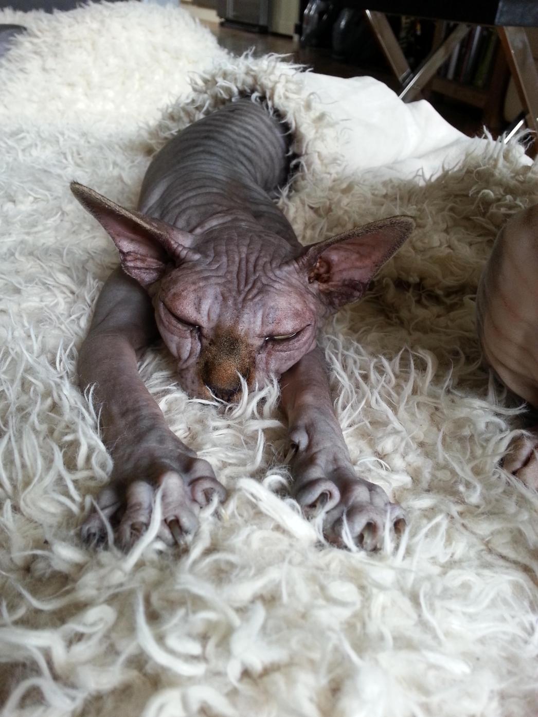 Met je kromme pootjes en je oude gerimpelde velletje. Je oogjes worden steeds kleiner, net als je lijfje, je bent al nooit 1 van de grootste geweest maar met de jaren krimp je steeds meer. Je bent veranderd in een vlieggewichtje, makkelijk in een kinderhandje te tillen. Over een paar maandjes wordt de 18 jaar. Waar is die tijd gebleven? Ik weet nog goed dat je bij ons binnen kwam. We hadden je opgehaald ergens in Velzen. Jij een klein wat schuw katje die heel voorzichtig naar ons toe kwam nadat al je broertjes en zusjes meteen al een flinke run deden. We hadden meteen zoiets van "ja, dit meisje willen we". Niet de eerste en snelste maar wel de wat verlegene, het meisje dat wat achterblijft, die wat buiten de groep valt. Je kwam bij ons als gezelschap voor ons andere Sphynx meisje "Ziggy".
